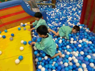 午前中はボールプールのエリアで遊びました。ボールの上を泳いだり、投げたり…、思い思いに過ごしていました。